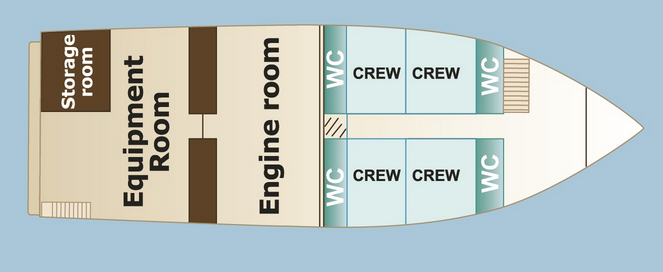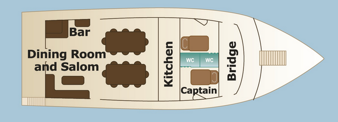 Guest accomodations: 8 double cabins each with toilet and shower. All cabins with air – condition and with fan.