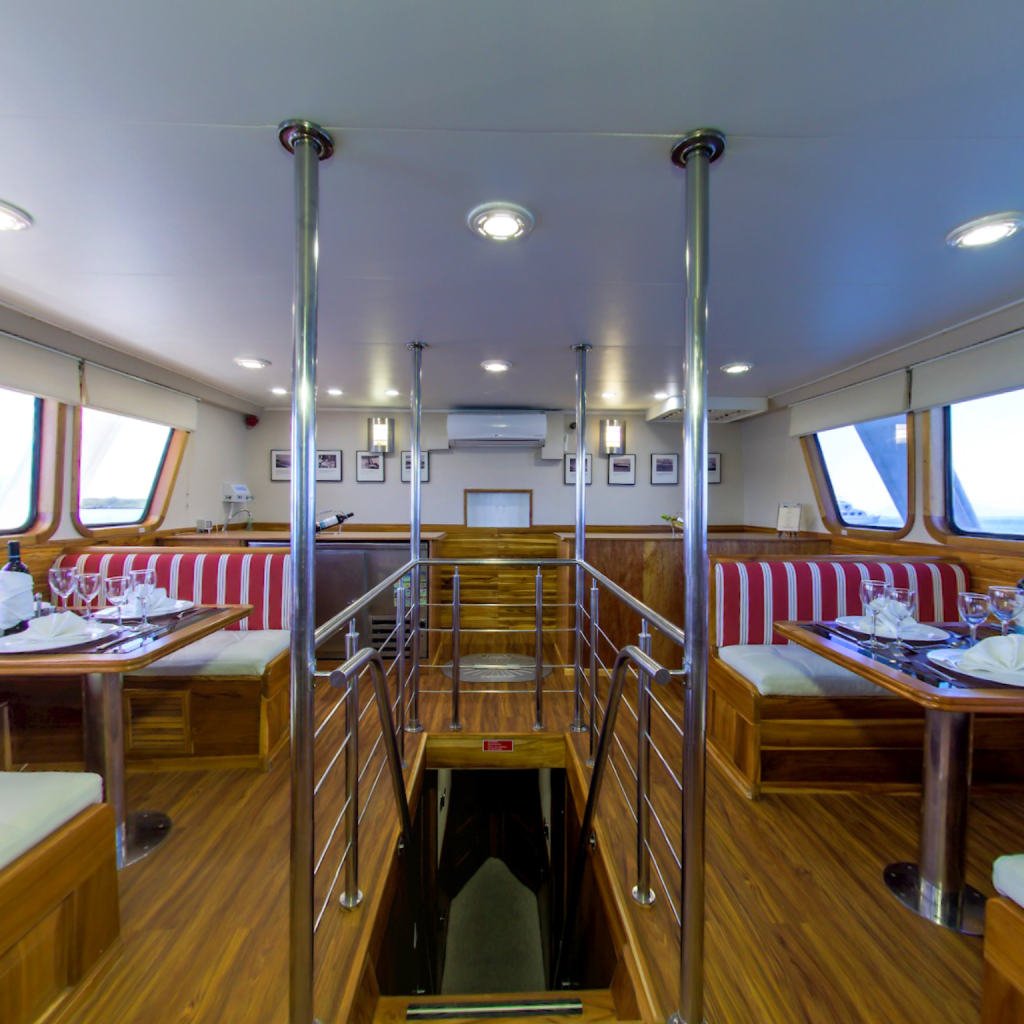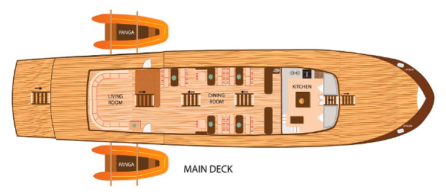 When arriving to our yacht, after your dives, you will be received with hot towels at the spacious diving deck where you will find one section which can be closed, to obtain a warm atmosphere for all our guests; al-Fresco hot showers; areas to clean the personal equipment, tables where to clean your underwater cameras, recharging station; individual gear bins; are additional services.