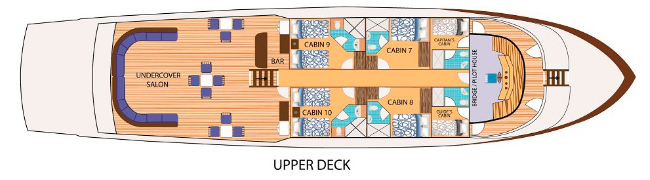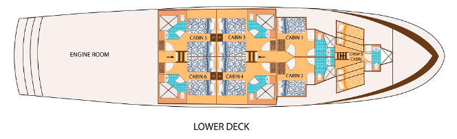 2 cabins with one double lower berth (cabins: 7 & 8) 2 cabins with two single lower berths (cabins 9 & 10)
