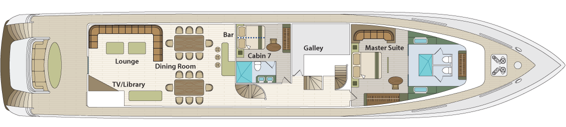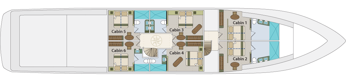 Lower deck: 6 rooms Sun Deck: Jacuzzi (Please, check with your guide or Cruise Director for the Jacuzzi times.) |