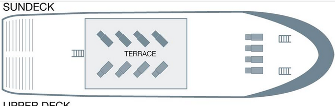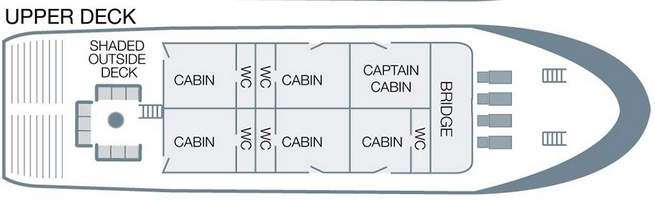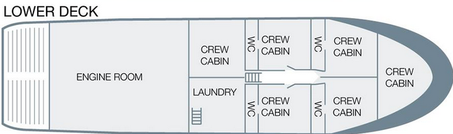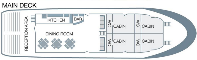 4 doubles cabins (double bed) lower deck, 4 doubles cabins(lower twin beds) main deck,1 suite(double bed) upper deck, 1 double cabin(lower twin beds) sun deck, air conditioner, hot water,private bathroom, TV,DVD, sound equipment,bar sun deck, living room, dinning room. |