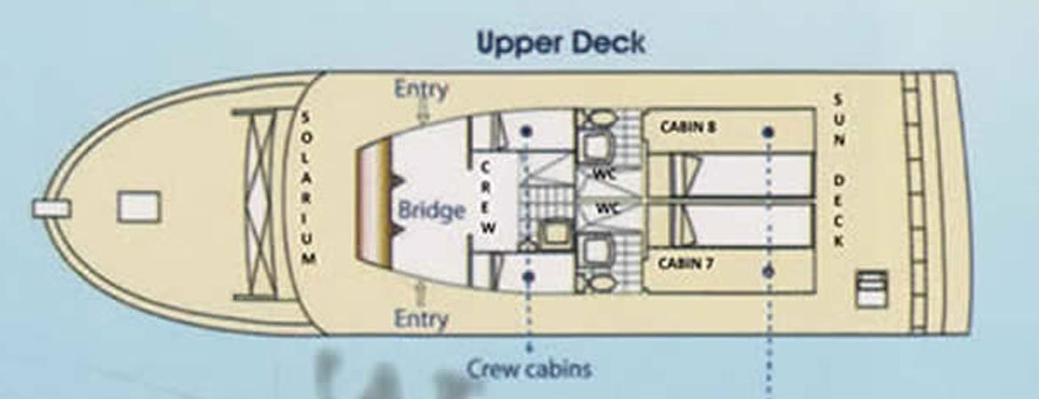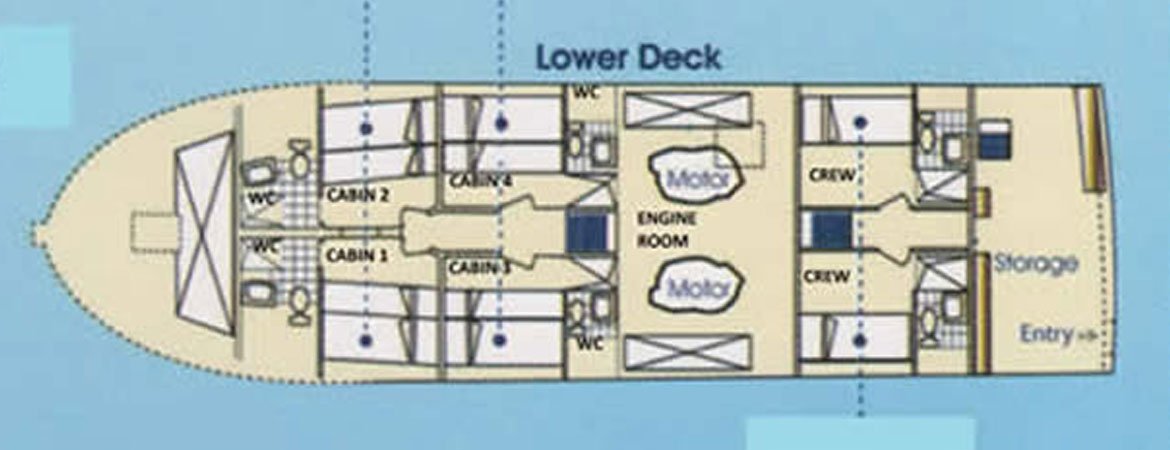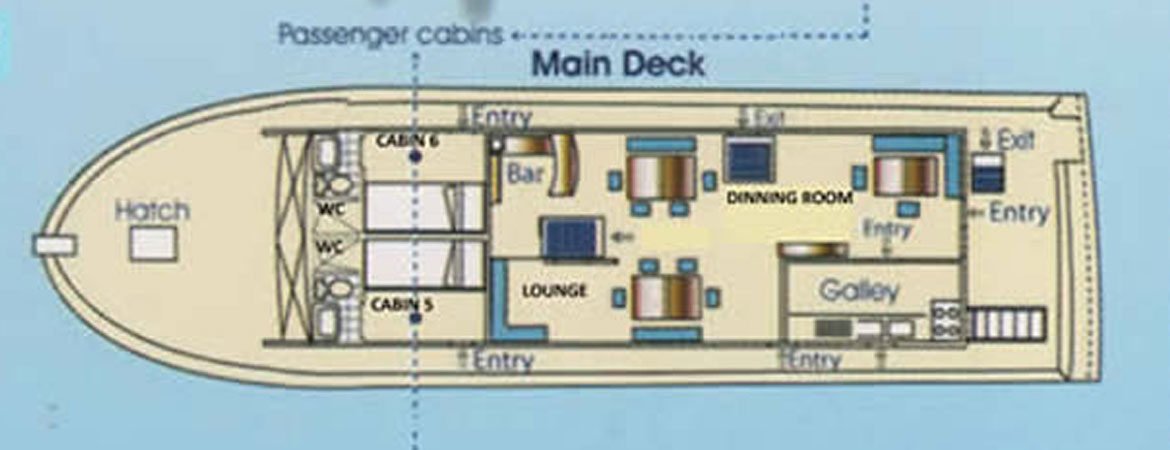 Its design is based in efficiency and comfort with ample social areas and 8 cabins 2 in main deck,2 in upper deck and 2 in solarium providing optimum comfort for your experience exploring the Galapagos. She takes 16 guests in double cabins with private facilities, A/C and hot water and desalinate having unlimited water.