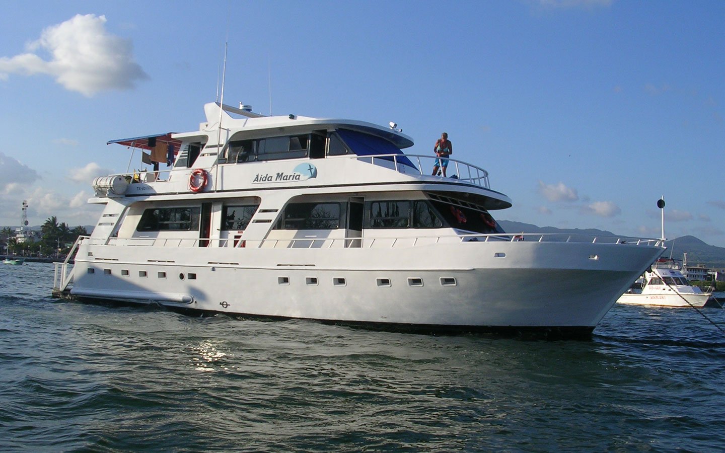 The sixteen passengers Aida Maria offers a great combination of comfort, style and economy for tours in the Galapagos. Each of the eight double cabins has a private bath and hot shower, air conditioning and an ample external deck to enjoy sunny Galapagos days. Started operating in the galapagos in 1997offering cruises around the islands as a charter yacht as well as for individual travelers.