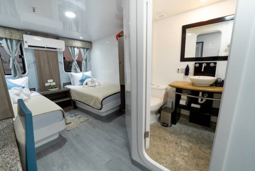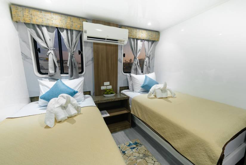 The M/C Galapagos Anahi is a Power Catamaran boat built in Guayaquil, Ecuador in 2006 taking into account the highest standards of first and comfort. She offers comfortable accommodations in 6 twin bed cabins (14 m2 / 151 square feet, each) located in the main deck and 2 suite cabins (18 m2 / 193 square feet. each) located in the upper deck. All cabins feature private facilities, locker and closet, air conditioned. Additionally the yacht has ample resting areas, sundeck, library, TV-DVD room, comfortable dinning room, bar and lounge and Jacuzzi.