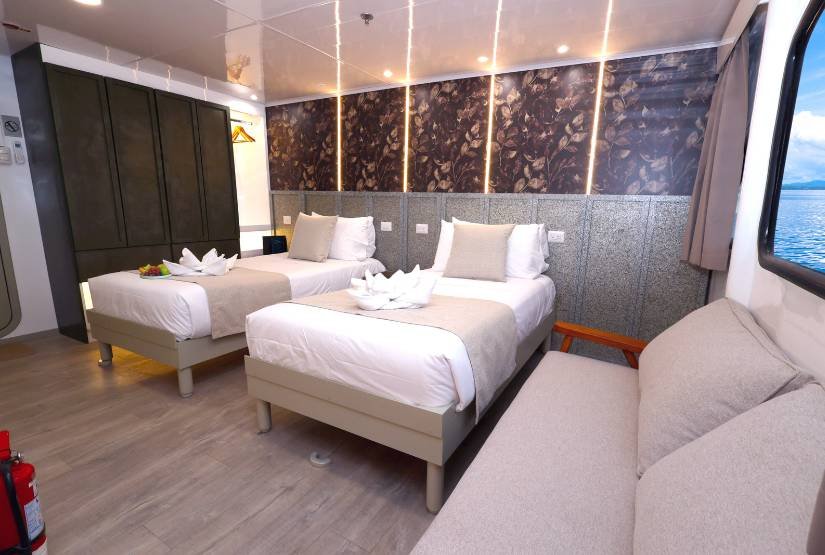 This wonderful catamaran offers 8 double cabins: 4 located in Upper Deck and 4 in the main deck; the Upper cabins are able to be connecting between them. Additionally, all cabins can be twin or matrimonial. Private facilities in each cabin: private bathrooms, cold/hot water; air conditioned, hair dryer, telephone for internal communication on board, safe box, and high speaker.