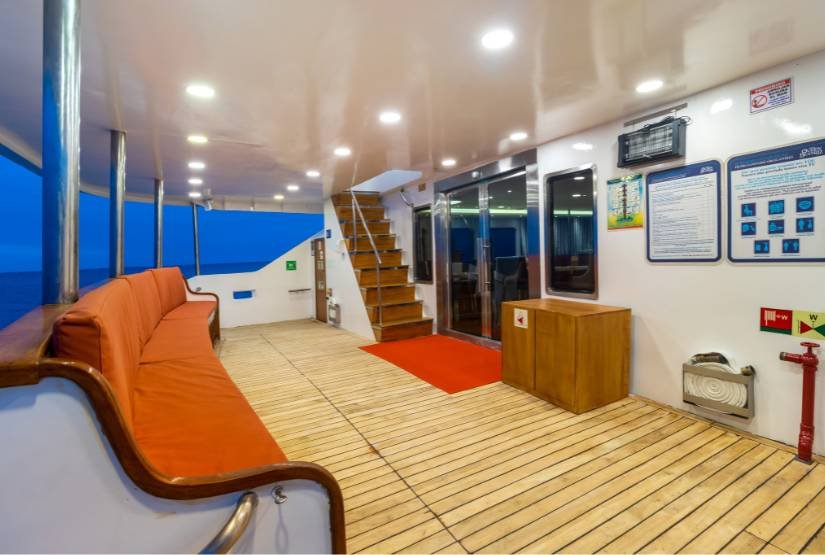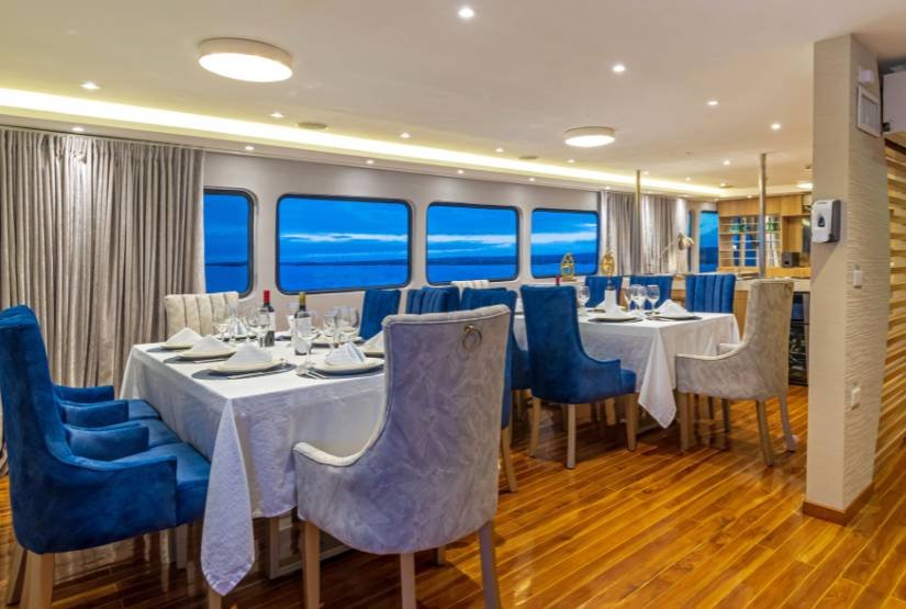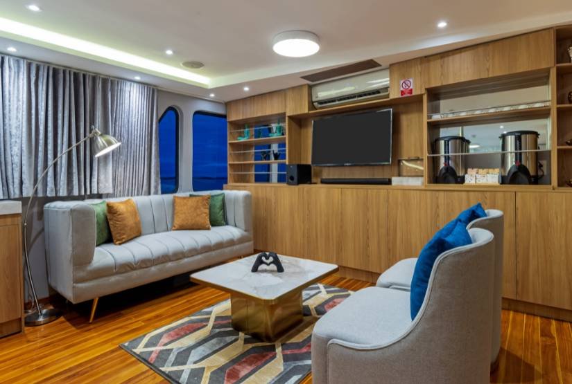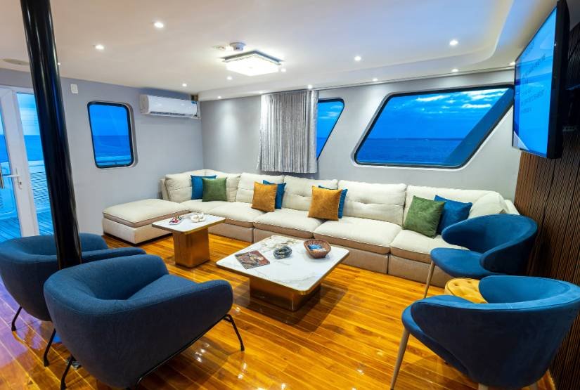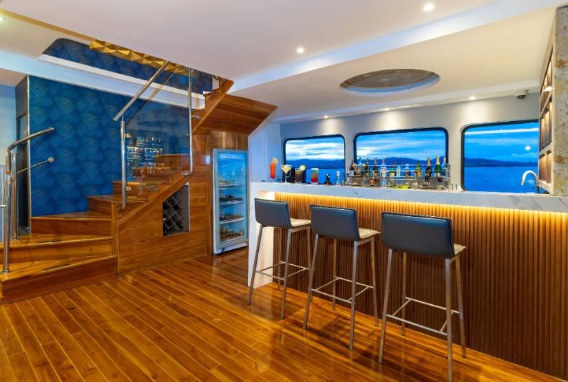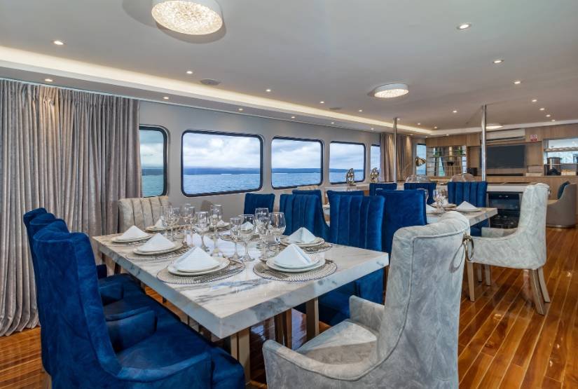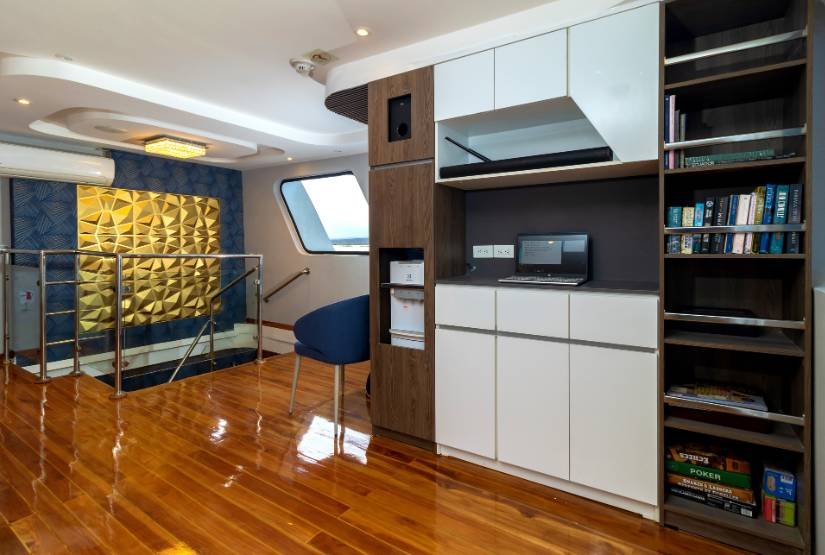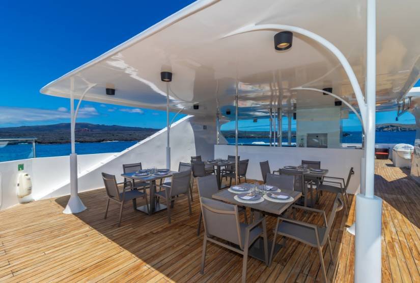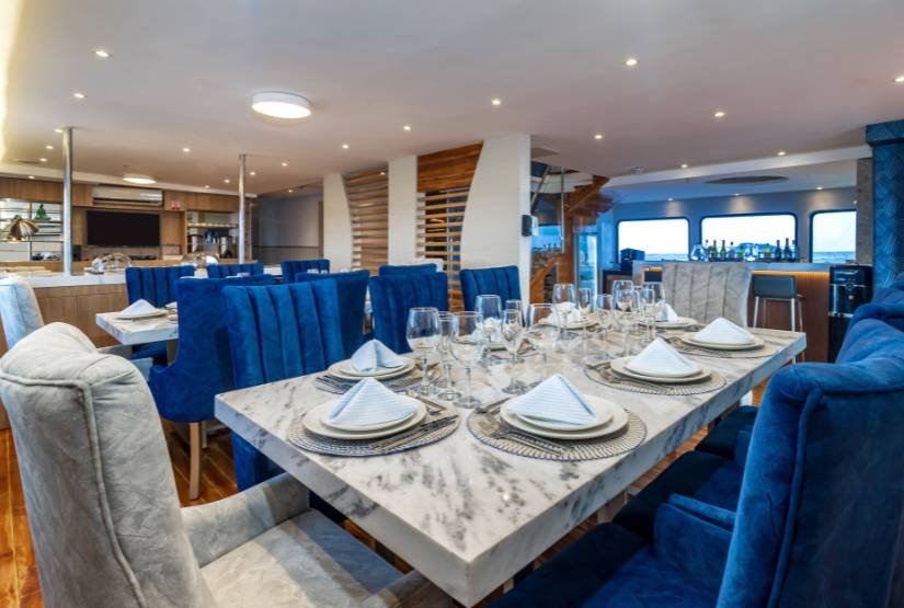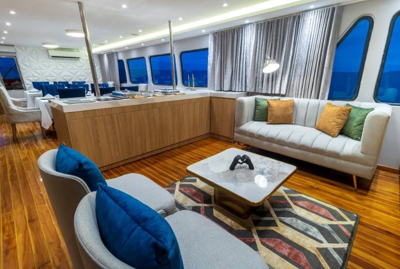 Social area: Grand Queen Beatriz Catamaran boat has one dining room, one lounge with DVD player, one bar, one sundeck with Yacuzzi, bar and one open dining, sun terrace.