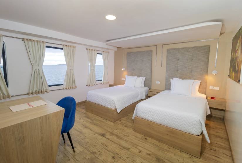 The Grand Queen Beatriz yacht is a beautiful luxury cruise ship. She is fitted with contemporary interior design and luxurious touches throughout. Each cabin on the ship is spacious and luxurious with a private balcony, comfortable lower beds, and bathroom amenities. The yacht also has a sun terrace with Jacuzzi, a dining room, and lounge area. In addition to the luxurious accommodations and a relaxing atmosphere, the ship is equipped with kayaks for guest use.