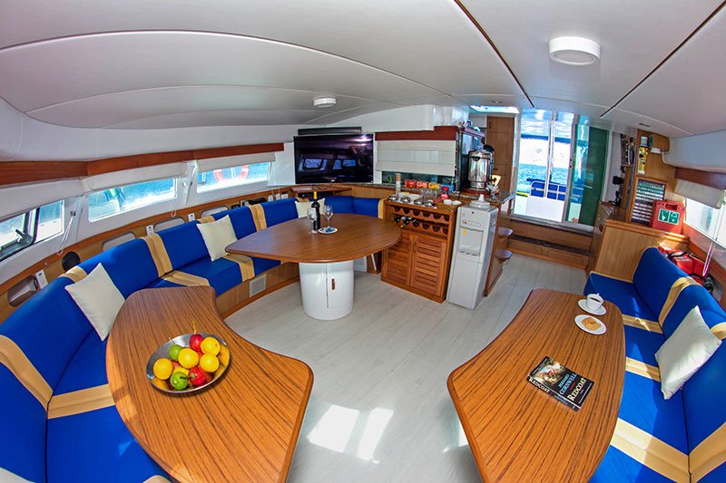 1 Captain, 1 Helmsman, 1 Deck sailor, 1 Bartender, 1 Cooker, 1 Machinist, 1 Certified bilingual naturalist guide