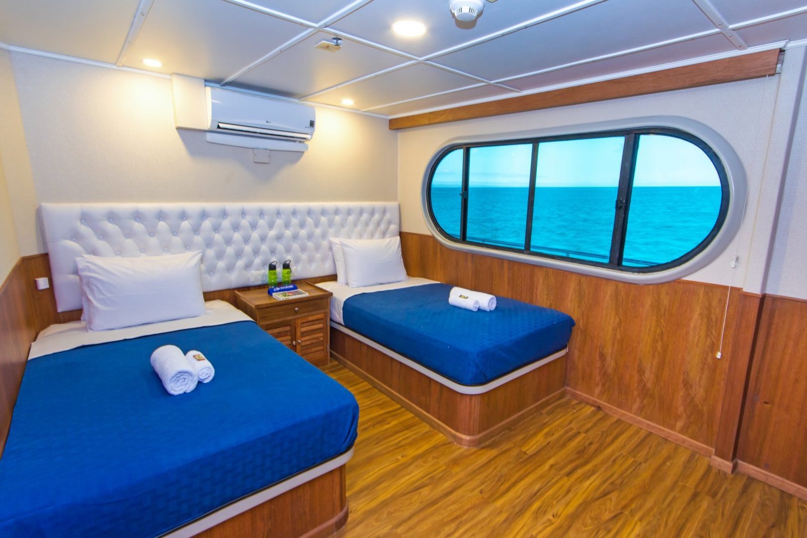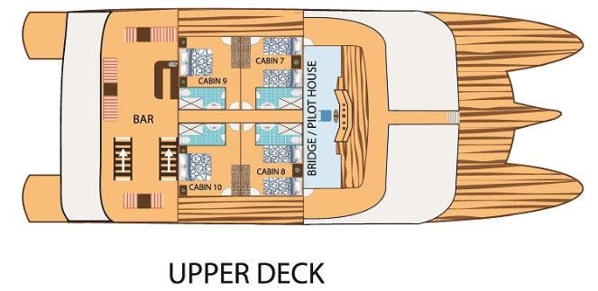 Aboard the Tip Top II Catamaran guests will find ample space to relax. The comfortable lounge has a flatscreen TV and AC, making it the perfect place to enjoy the cool air. For sun lovers the spacious sun deck has cushioned loungers and there is an outdoor lounge & bar which is a great place to take advantage of the sea breeze and enjoy a cool beer or glass of wine whilst discussing the days events. The Tip Top II Catamaran accommodates just 16 guests in 10 cabins. Each cabin has a private bathroom (toilet, shower, wash basin and vanity), locker and drawers, hair dryer, safety box and is air conditioned.
