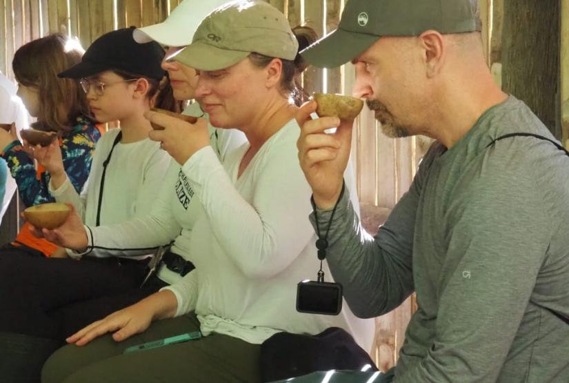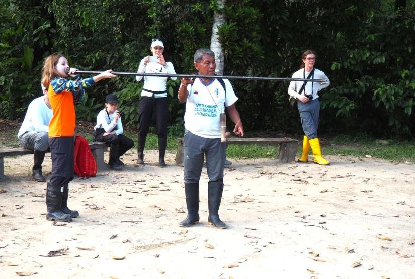 - 14:30 Anaconda Island: It is located in between the Napo and Arajuno rivers place where live some Kichwa indigenous families live. We will have the opportunity to visit one of them and become familiar with their customs and traditions. You will have an opportunity to sample ’chicha’ (traditional beverage) and cassava, which is a basic feature of the Kichwa diet. You will also learn about and practice their ancient hunting methods and their use of the blowgun. Upon entering the island, we will pass through the margins of a small swamp inhabited by “hoatzines” (called prehistoric birds) and caimans that we can observe in their natural habitat. (2-3 hours approx.)
